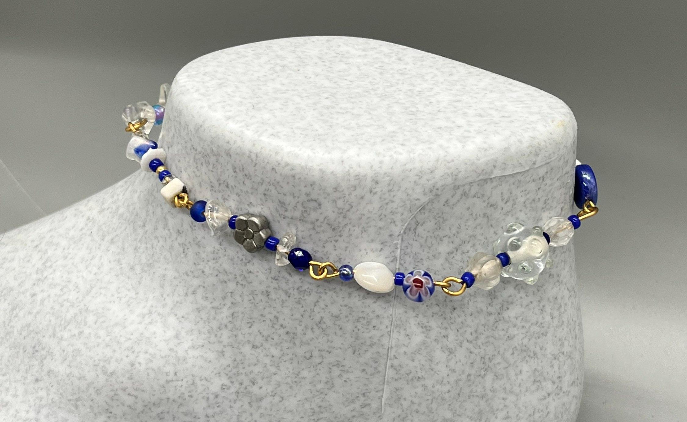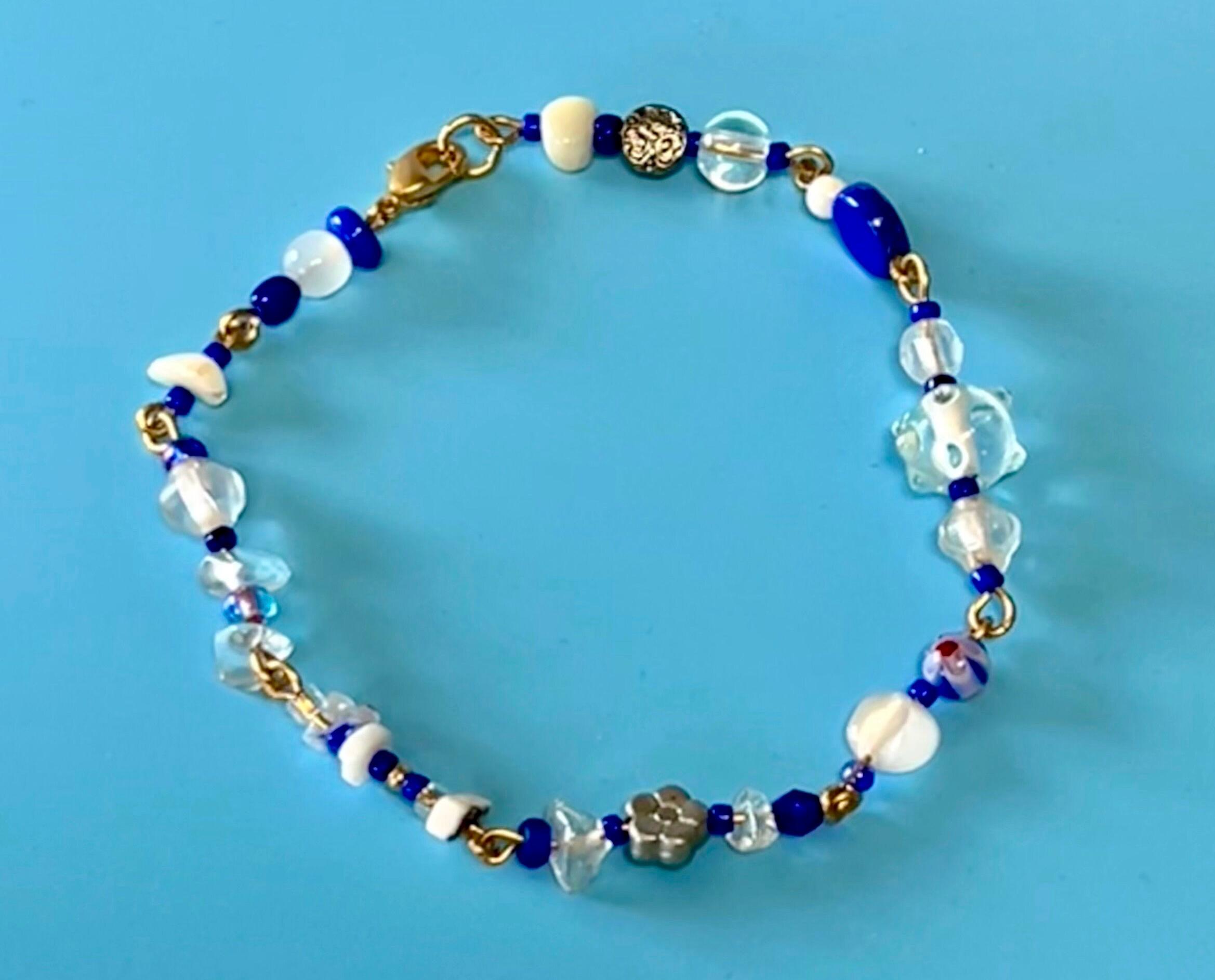 Add a touch of subtle bling to your ankle with this beautiful blue, white, and gold anklet. Handmade with care, this monochrome ankle bracelet features a mix of medium sized beads that add an elegant touch to any outfit. Perfect for both everyday wear and vacation jewelry, this anklet is a versatile addition to your wardrobe.