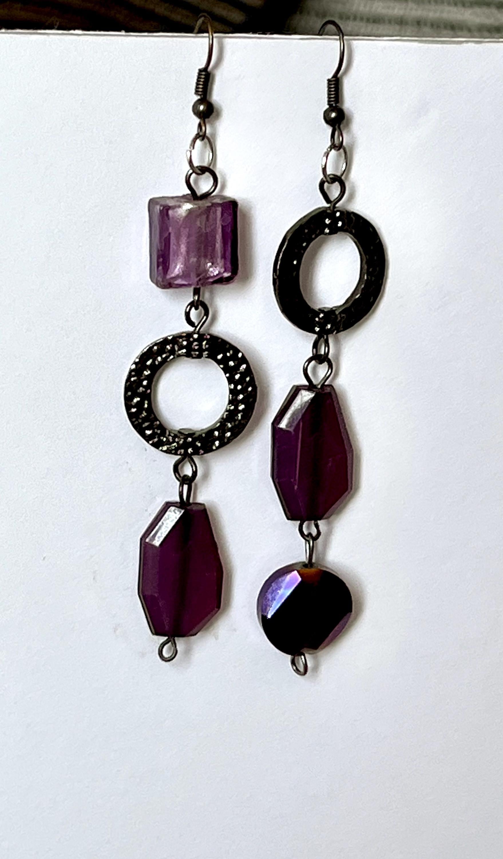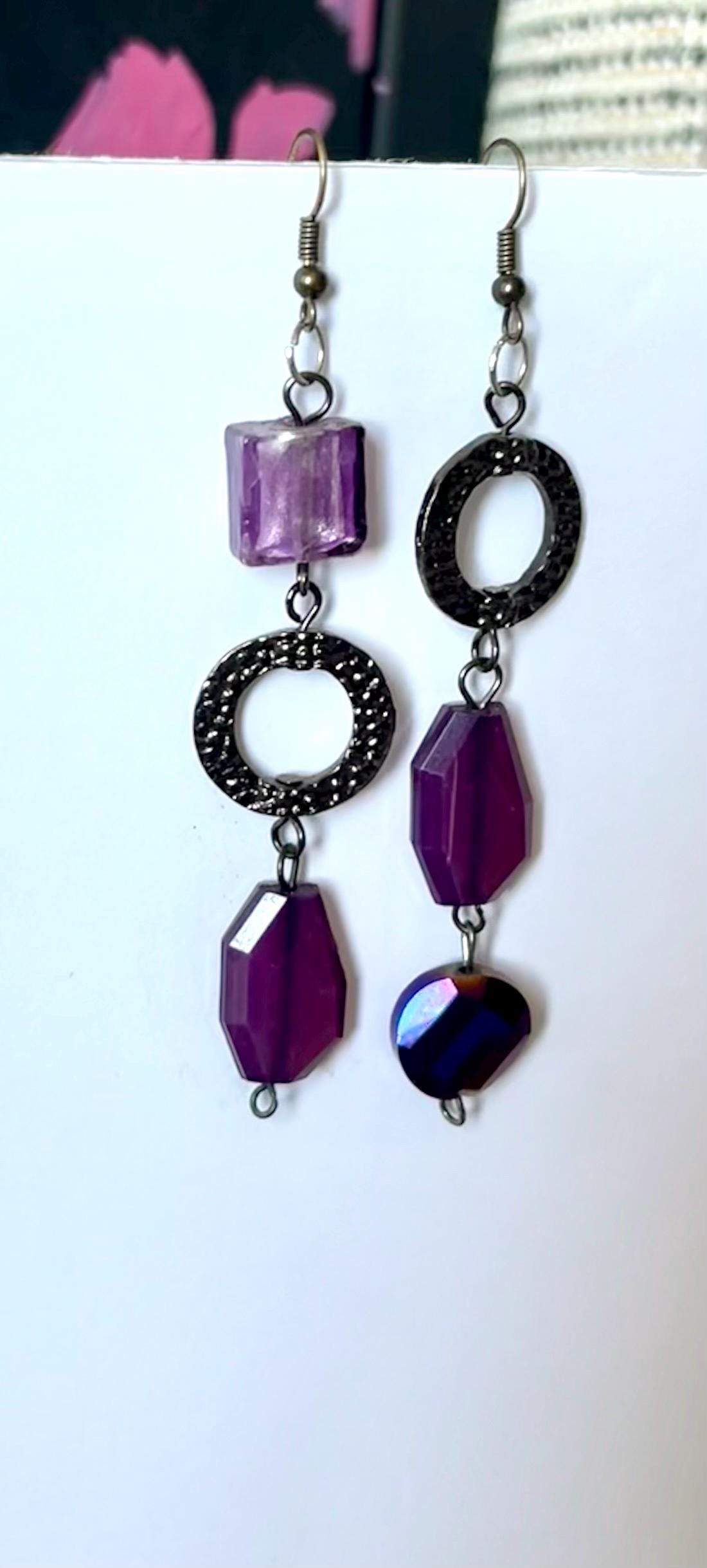 Discover the allure of these women’s unique long earrings, designed to captivate with their deep purple mismatch charm and majestic regal style. Each pair showcases eye-catching purple bead jewelry that tells a story of thoughtful upcycling and artistic craftsmanship. Perfect for those seeking comfort fit earrings that stand out with dark metal findings and a distinctive, elegant flair.