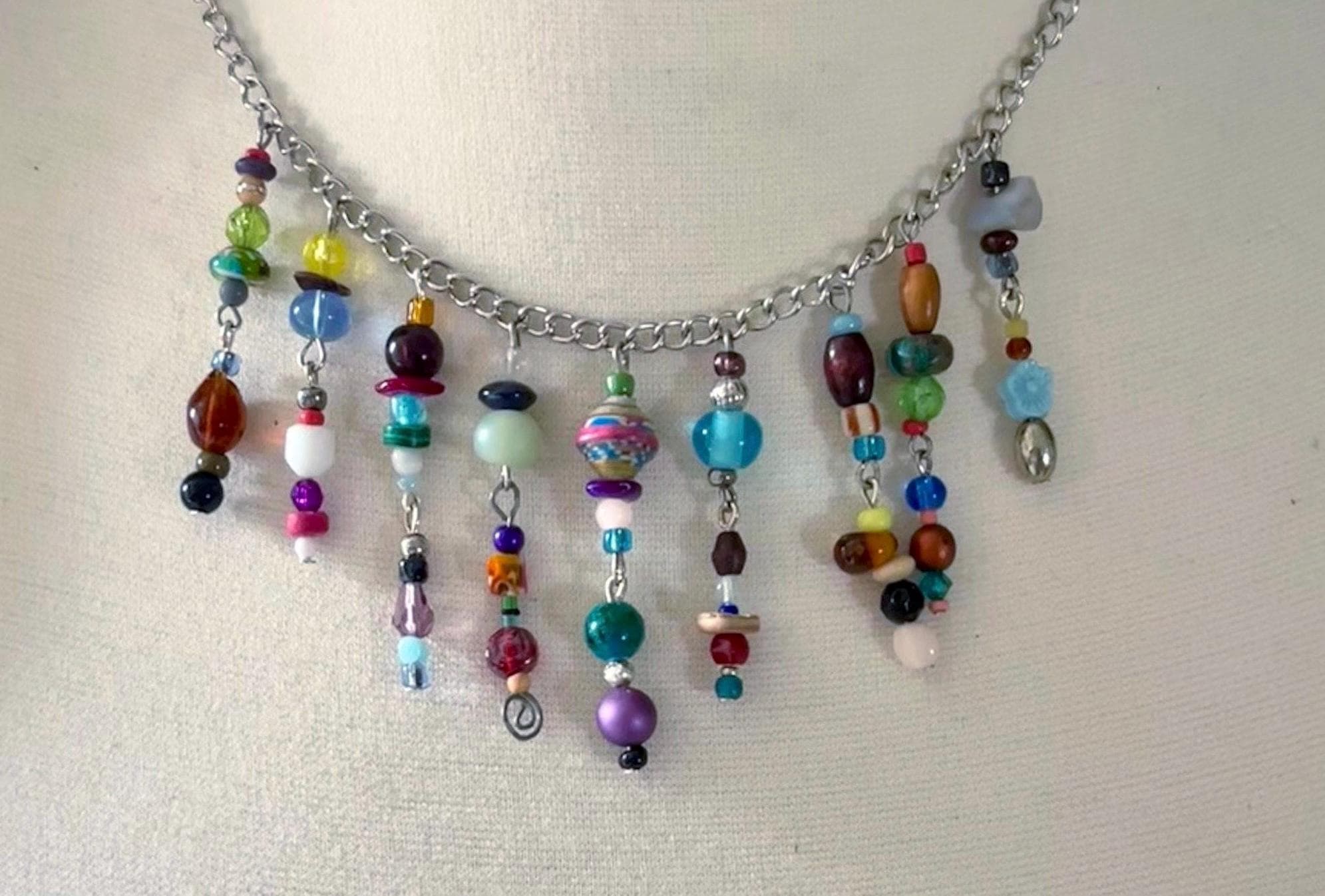 Discover the charm of individuality with this handmade wire linked necklace, designed for those who embrace unique bib necklace styles. Featuring nine handmade charms crafted from diverse materials like shell and wood beads, this piece blends boho chic statement vibes with everyday elegance. Whether dressing up or down, this lobster claw closure necklace offers a perfect fit and a standout look for any occasion.